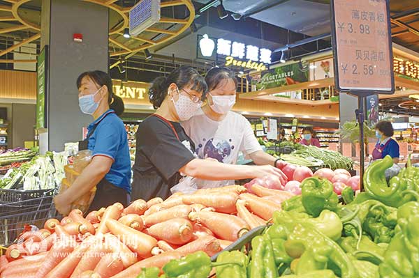 7月3日,市民在華夏超市選購(gòu)商品。近期,宿城各大超市米面油、蔬菜、水果、肉類等生活必需品供應(yīng)充足、品種豐富、價(jià)格穩(wěn)定,可滿足市民日常需求。 記者 王明輝 攝