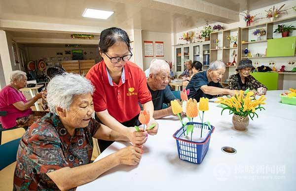 在工作人員的指導(dǎo)下,社區(qū)老人學(xué)習(xí)手工制作。