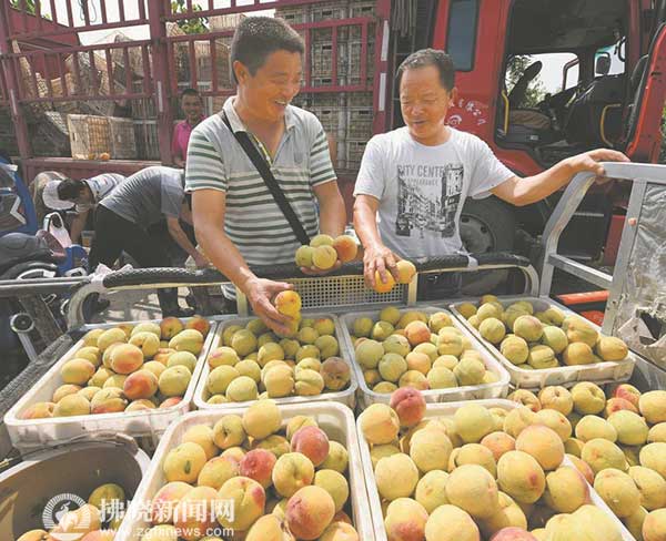 碭山縣碭城鎮(zhèn)蔣營村果農正在售賣黃桃。