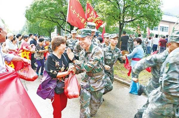 駐宿部隊(duì)抗洪搶險(xiǎn)后受到群眾的熱情歡送。