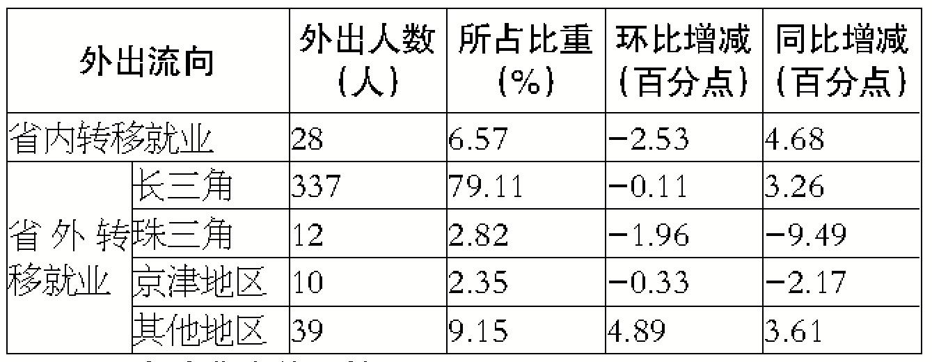 從外出人員流向來看,九成以上務(wù)工人員選擇省外就業(yè),其中長(zhǎng)三角地區(qū)占79.11%,環(huán)比下降0.11個(gè)百分點(diǎn),同比上升3.26個(gè)百分點(diǎn);其次是其他地區(qū)占9.15%,環(huán)比、同比分別上升4.89和3.61個(gè)百分點(diǎn);珠三角占2.82%,環(huán)比、同比分別下降1.96和9.49個(gè)百分點(diǎn);京津地區(qū)轉(zhuǎn)移人數(shù)最少,占2.35%,環(huán)比、同比分別下降0.33和2.17個(gè)百分點(diǎn)。本期省內(nèi)轉(zhuǎn)移就業(yè)人數(shù)占比6.57%,環(huán)比下降2.53個(gè)百分點(diǎn),同比上升4.68個(gè)百分點(diǎn)(見下表)。