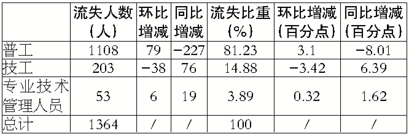 本季度,被監(jiān)測(cè)企業(yè)累計(jì)流失員工1364人,環(huán)比增加3.57%,同比減少8.82%。與上季度相比,普工和專業(yè)技術(shù)管理人員流失比重分別上升3.1和0.32個(gè)百分點(diǎn),技工流失比重下降3.42個(gè)百分點(diǎn);與去年同期相比,普工流失比重下降8.01個(gè)百分點(diǎn),技工和專業(yè)管理人員流失比重分別上升6.39和1.62個(gè)百分點(diǎn)(見下表)。