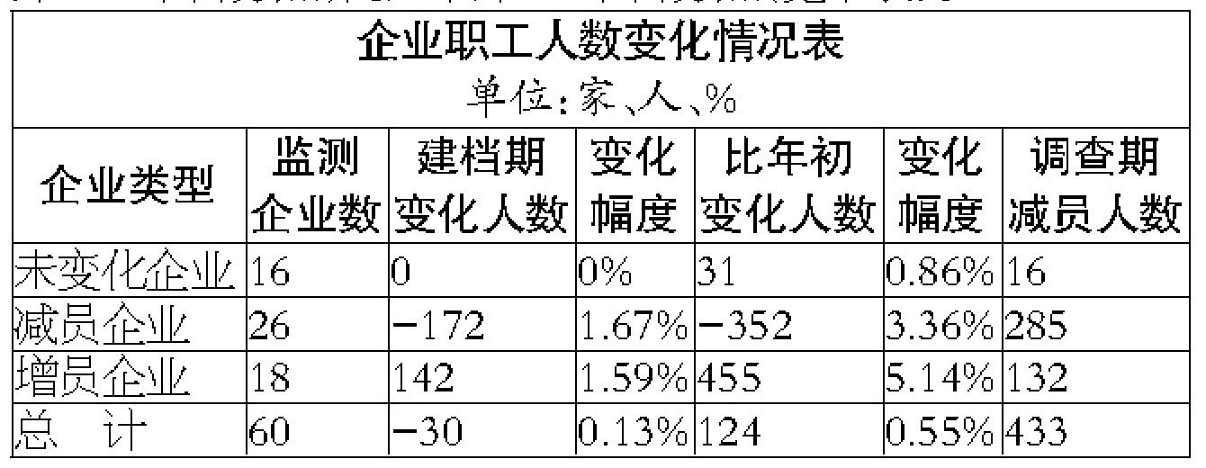本季度末,60家監(jiān)測企業(yè)在崗職工22846人,比上月末減少30人,減幅為0.13%。其中,增員企業(yè)18家,占監(jiān)測企業(yè)數(shù)的30%,環(huán)比下降13.33個百分點,同比上升3.33個百分點;增員142人,增幅0.62%,環(huán)比下降0.56個百分點,同比上升0.29個百分點;減員企業(yè)26家,占監(jiān)測企業(yè)數(shù)的43.33%,環(huán)比、同比分別上升6.66和3.33個百分點;減員172人,減幅0.75%,環(huán)比上升0.31個百分點,同比下降0.6個百分點(見下表)。