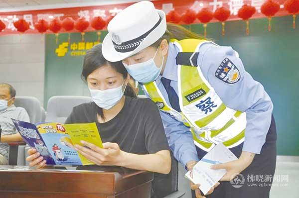 交警進(jìn)單位宣傳交通安全知識(shí)。