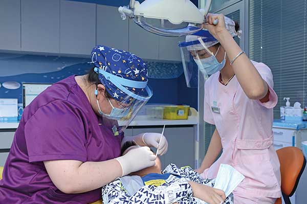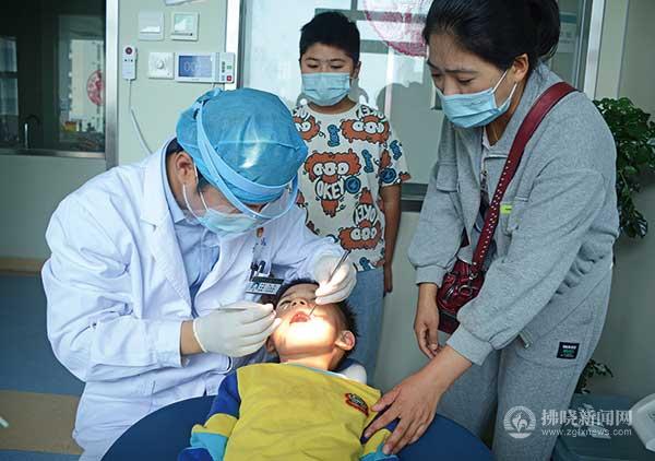 市立醫(yī)院口腔科醫(yī)護人員為小患者進行口腔健康檢查。