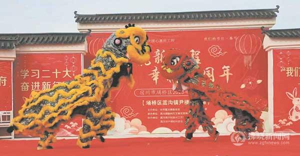 埇橋區(qū)蒿溝鎮(zhèn)尹樓村舉辦的鄉(xiāng)村春晚舞臺上,演員表演“金獅賀歲”。 特約攝影 張成伍