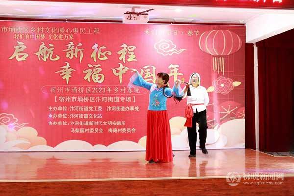 埇橋區(qū)汴河街道辦事處群眾自導(dǎo)自演的“啟航新征程 幸福中國年”鄉(xiāng)村春晚現(xiàn)場,戲曲表演備受歡迎。 特約攝影 丁輝