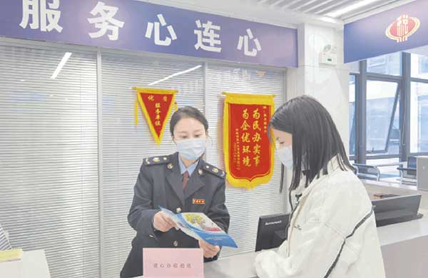 3月21日,蕭縣政務服務中心“愛心辦稅”通道的工作人員向前來辦理業(yè)務的群眾宣傳相關減稅政策。 張祖北 攝