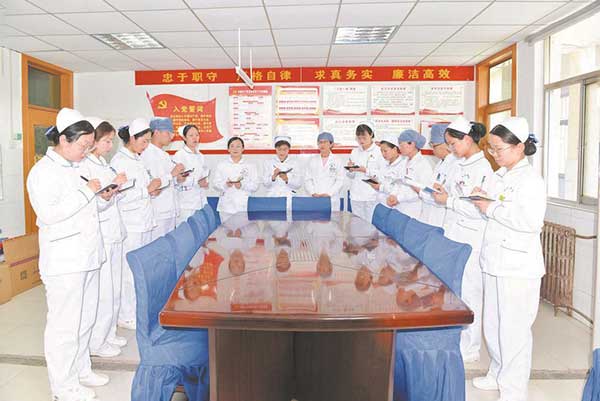 “××床下肢栓塞,交班護(hù)士要交代家人不要拍打下肢……”早上7點(diǎn)半,市立醫(yī)院南區(qū)感染科進(jìn)行早交班。夜班醫(yī)護(hù)值班人員對(duì)病區(qū)患者病情進(jìn)行交接,護(hù)士長劉湘云對(duì)護(hù)理交班內(nèi)容進(jìn)行點(diǎn)評(píng)及重點(diǎn)工作提醒,護(hù)士們認(rèn)真記錄。科主任總結(jié)并交代注意事項(xiàng)。會(huì)后,大家各司其職,抽血、配藥、輸液……開始了一天忙碌的工作。