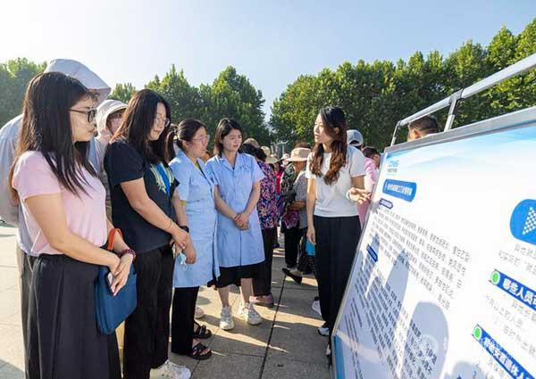 9月6日上午,在宿城銀河廣場,市醫(yī)保局工作人員向市民宣傳“國家集采藥品進(jìn)藥店”醫(yī)保政策。