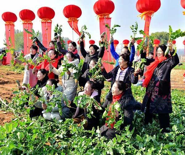 11月12日,蕭縣龍城鎮(zhèn)帽山村“蘿卜采收節(jié)暨品鑒觀摩會”在帽山腳下舉行。雖已入冬,但田間地頭,一片熱火朝天的景象。菜農(nóng)們挖的挖、屯的屯,吆喝著搭檔配合抬放;婦女們盛裝上陣,變身“網(wǎng)紅達(dá)人”,站在蘿卜地里帶貨直銷,為家鄉(xiāng)宣傳;鎮(zhèn)文化站組織了簡樸而又熱烈的文藝表演,載歌載舞,慶祝蘿卜豐收;電視臺現(xiàn)場連線,進(jìn)行助農(nóng)直播;蕭縣駐北京、上海等地商會負(fù)責(zé)人也親臨收獲現(xiàn)場,親口嘗一嘗“彎腰青”的味道;適逢星期天,不少城市居民也帶著孩子,走進(jìn)田野,體驗農(nóng)耕文化的樂趣。