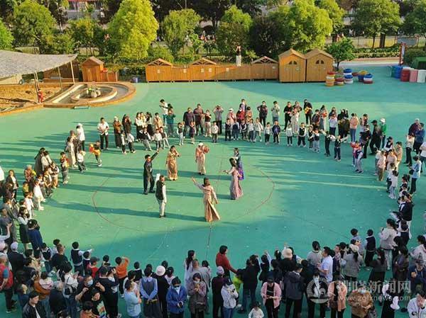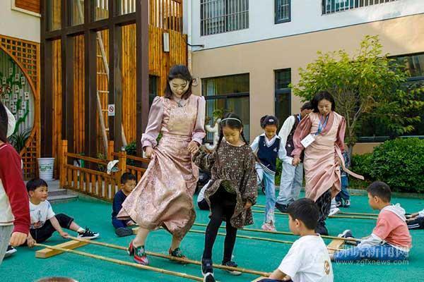 措美縣教師次珠在埇橋區(qū)第二幼兒園帶領(lǐng)孩子們跳竹竿。