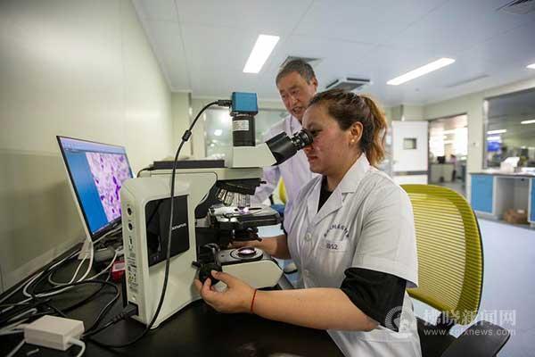 措美縣醫(yī)生德吉在市立醫(yī)院(北區(qū))檢驗科使用生物顯微鏡觀察細(xì)胞。