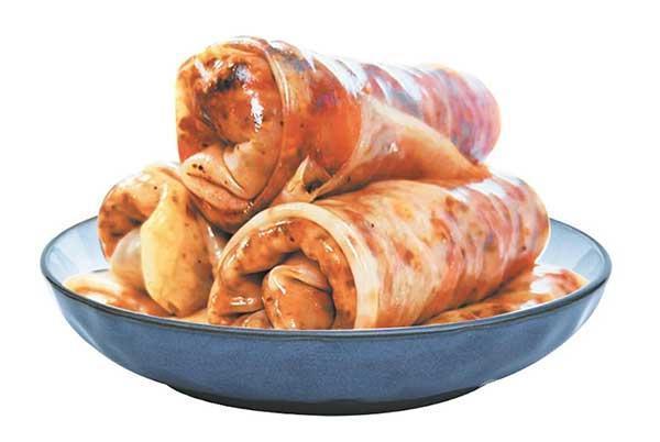 小鎮(zhèn)物產(chǎn)豐富,美食便多,素有“來新莊不吃扦子不算席”之說的扦子享有百年盛名。清代雍正年間的《食憲鴻秘》中記載了一道魯菜:“卷煎,將蛋推皮,以碎肉加料卷好,仍用蛋糊口。豬油、白糖、甜醬和燒。切片用。”這種做法便是新莊扦子的前身。