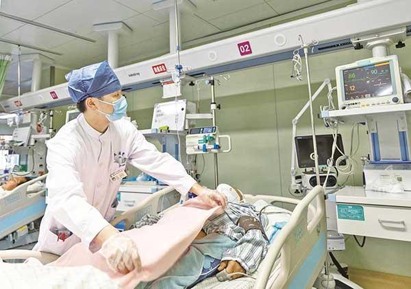 一扇厚重的鐵門,阻斷了急診重癥監(jiān)護室(EICU)危重病人和外界的接觸。剛剛送進來一位全身大面積骨折病人,搶救室已經(jīng)為他裝上頸托、建立靜脈通路、插上導尿管,EICU內(nèi)年輕的男護士王宇航隨后接手了這位病人的護理工作,小伙子一邊為病人整理床鋪一邊告訴記者:“我的工作主要是在醫(yī)生診斷后,時刻監(jiān)測病人生命體征,為病人清理身體、用藥治療?!痹谝幻V夭∪瞬〈睬埃痹\科醫(yī)生黃崇健為病人檢查后,向身邊的醫(yī)護人員仔細講述目前病人的情況,囑咐用藥注意事項。