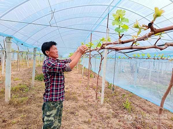時(shí)下正值大棚葡萄管護(hù)期,走進(jìn)朱集鎮(zhèn)星光村嘉莉葡萄園,大棚內(nèi)一派生機(jī)盎然,一株株葡萄藤吐著翠綠新葉,一串串花穗掩映在清新葉片中,旺盛地生長著,幽香撲鼻。種植戶曹配明正帶領(lǐng)工人們進(jìn)行掐穗、整理枝條、加固大棚鋼管、翻曬雞糞等農(nóng)事管理。看著葡萄園里熱鬧的景象,老曹喜在臉上、甜在心里。