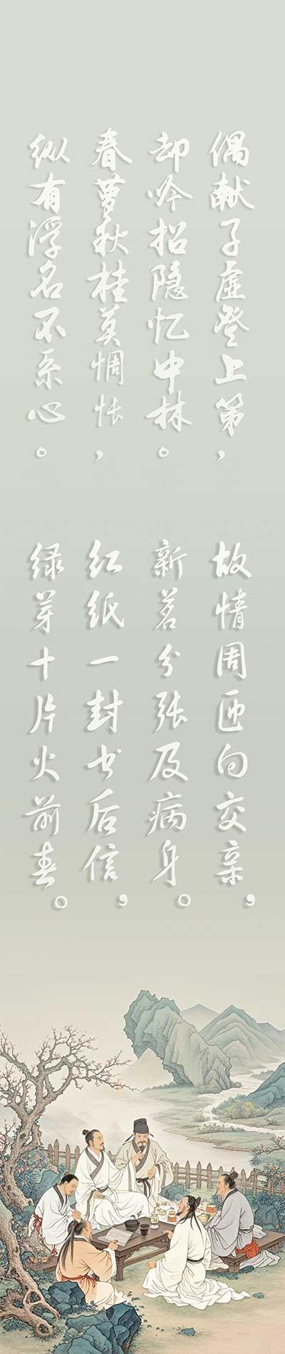 離開(kāi)符離后,白居易的仕途幾經(jīng)沉浮。他經(jīng)歷過(guò)科舉高中的喜悅,也遭受過(guò)被貶謫的痛苦;體驗(yàn)過(guò)官場(chǎng)的得意,也品嘗過(guò)人生的失意。但無(wú)論身處何種境地,他與“符離五子”的情誼始終歷久彌新。貞元十六年,白居易進(jìn)士及第,他第一時(shí)間便寫信給劉翕習(xí),與他分享這份喜悅,在信中,他詳細(xì)地描述了自己考試的過(guò)程和中第后的心情,同時(shí)也表達(dá)了對(duì)故友的思念之情;元和十二年,白居易收到蜀中友人寄來(lái)的新茶,他看著那嫩綠的茶葉,泡在水中漸漸舒展,仿佛看到了符離的山水和故友的面容,于是,他在《謝李六郎中寄新蜀茶》中寫下“故情周匝向交親”的佳句,借茶寄情,抒發(fā)對(duì)符離故友的深切思念。