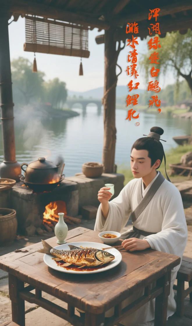 此時,少年白居易或許正挎著書箱經(jīng)過渡口,他駐足看漁人從青竹魚簍倒出活蹦亂跳的收獲,那條紅鯉格外醒目。少年心動,掏出幾枚銅錢買下,隨即在東林草堂旁的河灘架石為灶,拾柴生火。河灘上升起的炊煙里,漸漸飄出蔥姜與魚香交織的云朵。