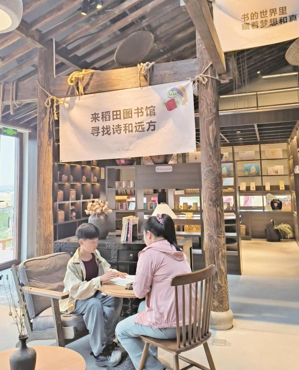 游客在埇橋區(qū)夾溝鎮(zhèn)鎮(zhèn)頭村的稻田圖書館享受假日書香。本報記者 攝