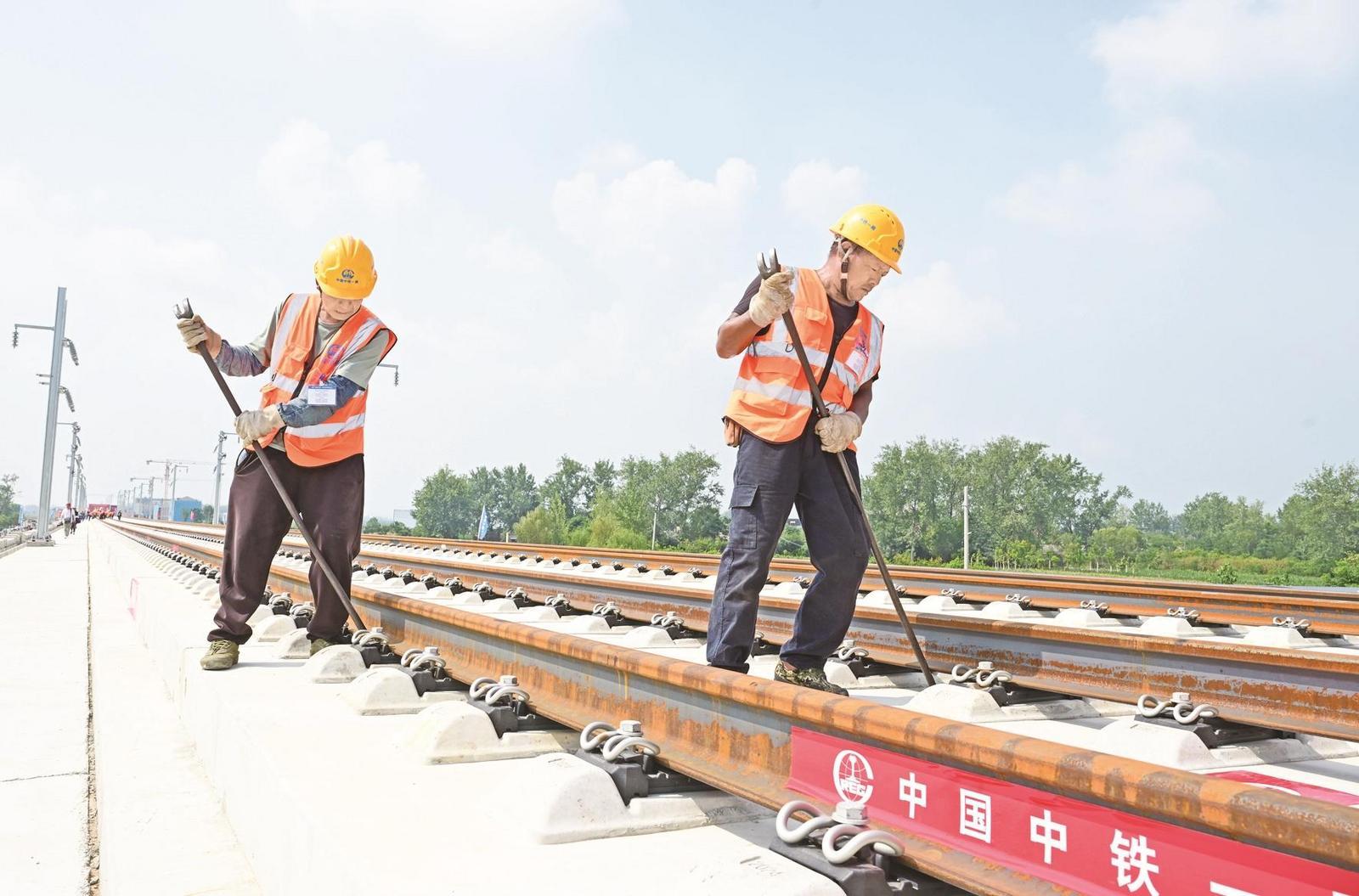 中鐵一局施工人員在淮宿蚌城際鐵路鋪軌施工現(xiàn)場作業(yè)。 新華社記者 周牧 攝