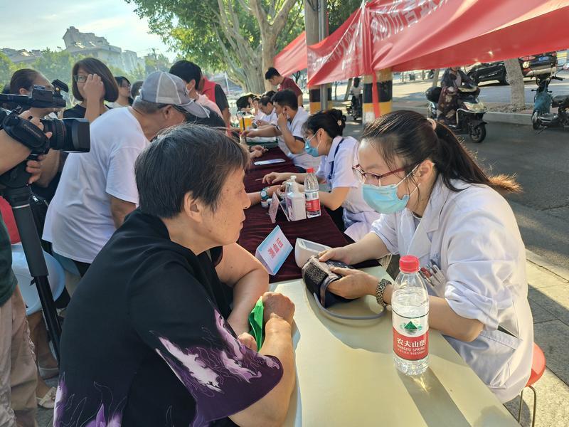 拂曉新聞網(wǎng)-拂曉報(bào)訊(文/圖 記者 曾慶芳)8月19日早上7點(diǎn)半,埇橋區(qū)東關(guān)街道大澤社區(qū)南門(mén)人頭攢動(dòng),埇橋區(qū)“大型健康義診進(jìn)社區(qū)”活動(dòng)在此開(kāi)展。市立醫(yī)院、市第一人民醫(yī)院、皖北煤電集團(tuán)總醫(yī)院、宿安醫(yī)院的醫(yī)護(hù)人員提前到場(chǎng),搭起診療臺(tái),擺好血壓計(jì)、血糖儀等設(shè)備,等候居民前來(lái)咨詢問(wèn)診。