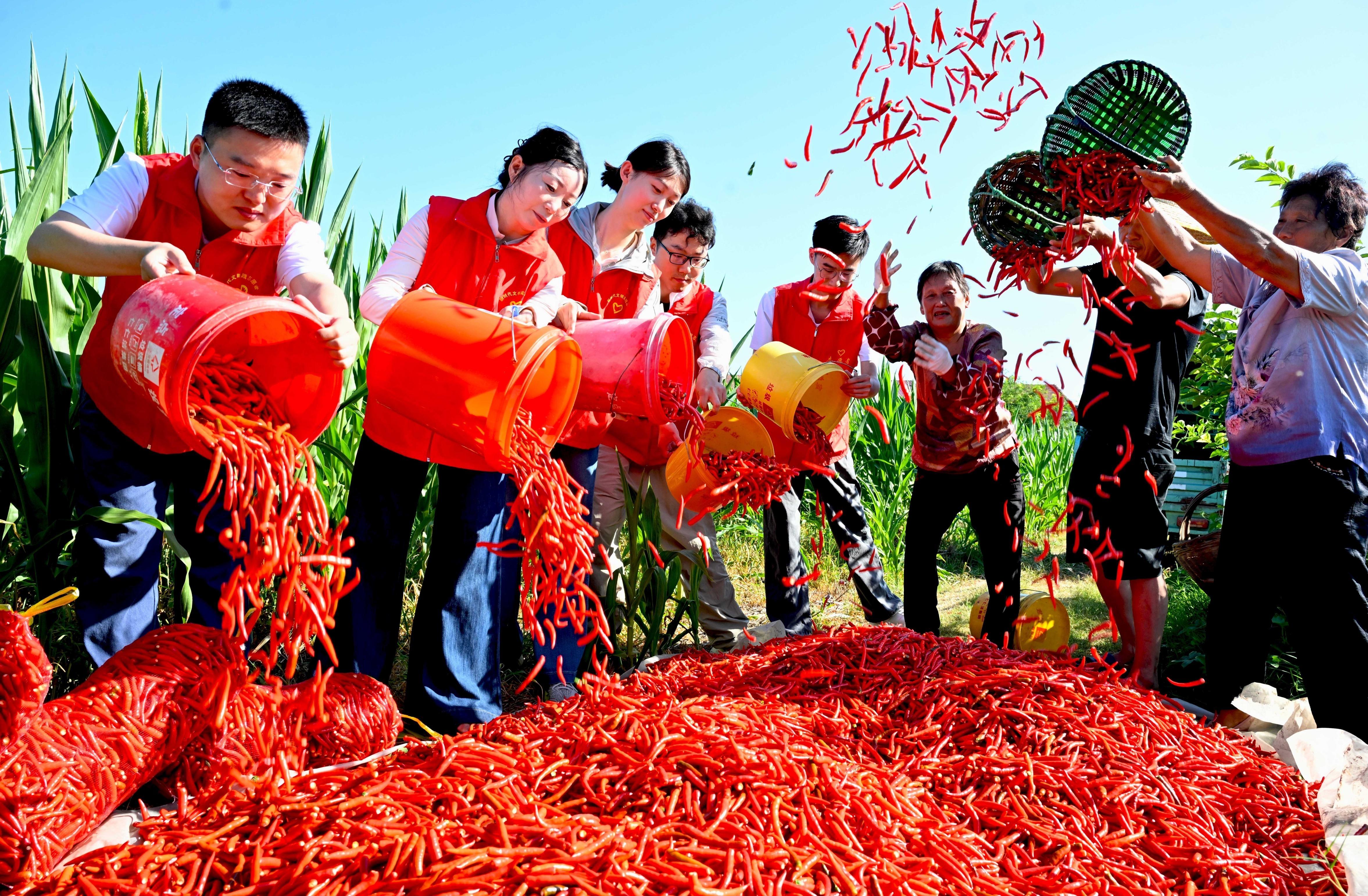 7月24日,在亳州市利辛縣孫集鎮(zhèn)許溝口村辣椒種植基地,黨員干部和村民一起收獲辣椒。 本報(bào)通訊員 劉勤利 紀(jì)靜靜 攝
