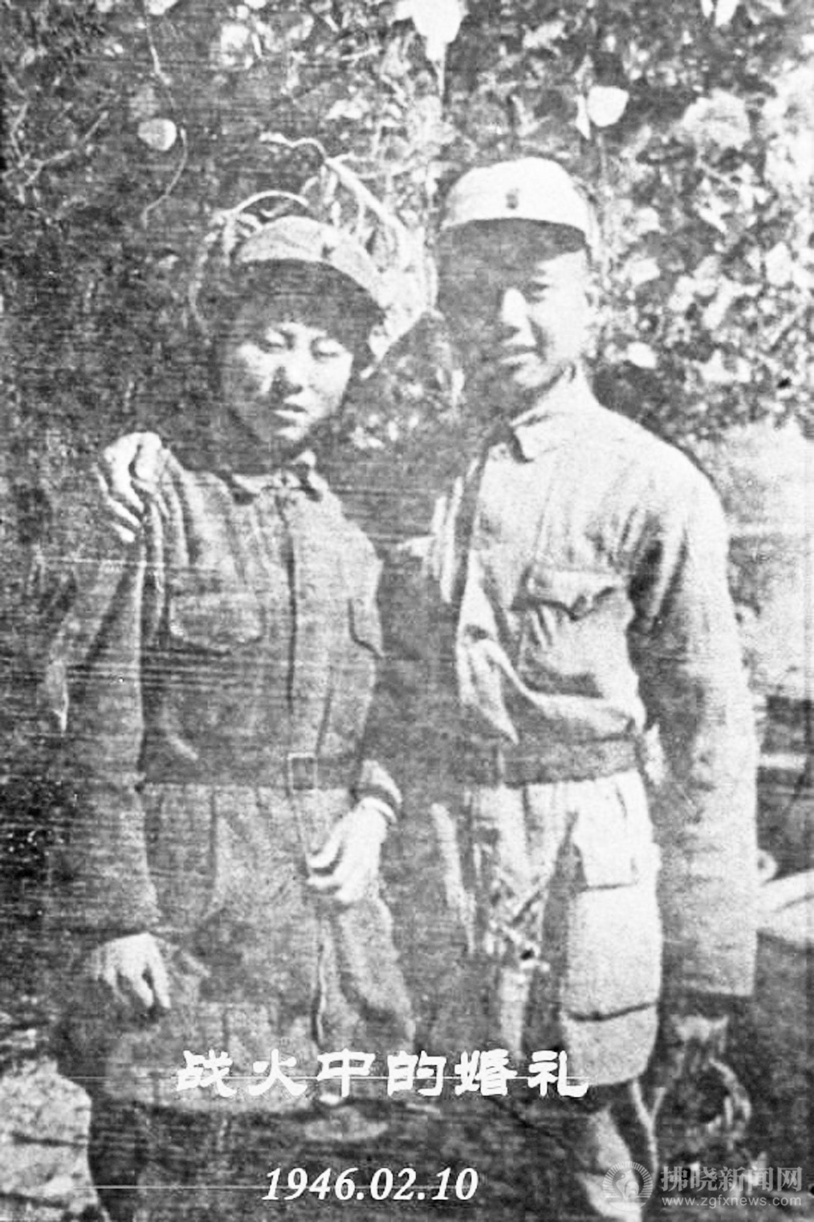 1946年初,組織批準(zhǔn)了父母親的結(jié)婚報(bào)告,并送了一床紅格土布做的被子和床單表示祝賀,戰(zhàn)友們用稻草為他們編了一床厚實(shí)的床墊。2月10日,新四軍四師的領(lǐng)導(dǎo)和戰(zhàn)友們?cè)诮K淮安的一戶人家大廳里為這對(duì)“拂曉戰(zhàn)友”舉辦了簡(jiǎn)樸而熱鬧的婚禮。四師聯(lián)絡(luò)部部長(zhǎng)任泊生特地帶來繳獲的日軍照相機(jī),為父母親拍了這張具有紀(jì)念意義的結(jié)婚照。