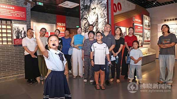 “彭雪楓將軍被毛澤東、朱德譽(yù)為‘共產(chǎn)黨人的好榜樣’。在左側(cè)墻面上方,紅色雕刻字‘將軍殉國,澤被長淮’,是對他光輝一生的高度概括……”9歲小講解員錢沐晨站在展板前,胸前的紅領(lǐng)巾格外鮮艷。他的聲音時(shí)而激昂,時(shí)而低沉,將彭雪楓將軍光榮而偉大的革命生涯娓娓道來。講到動(dòng)情處,他聲音微微顫抖,眼中泛起晶瑩的淚光,在場觀眾無不為之動(dòng)容。