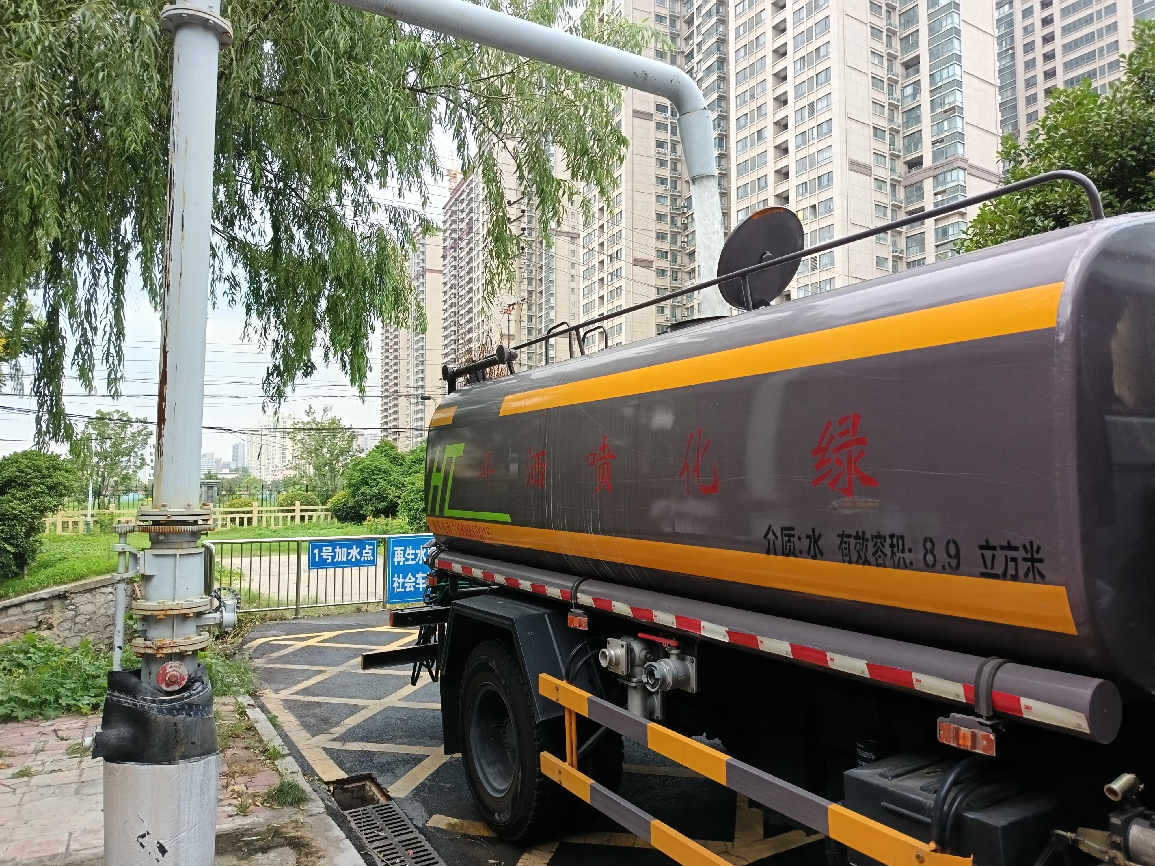 將設(shè)有取水口的水鶴與噴灑車對(duì)接好或?qū)⑺畮c環(huán)衛(wèi)車連接好,再生水便緩緩流進(jìn)了噴灑車、環(huán)衛(wèi)車的水箱……隨著一輛輛車從再生水取水點(diǎn)駛出,應(yīng)用至市政綠化澆灑、道路沖洗除塵的場(chǎng)景,已成為淮北街頭“一景”。