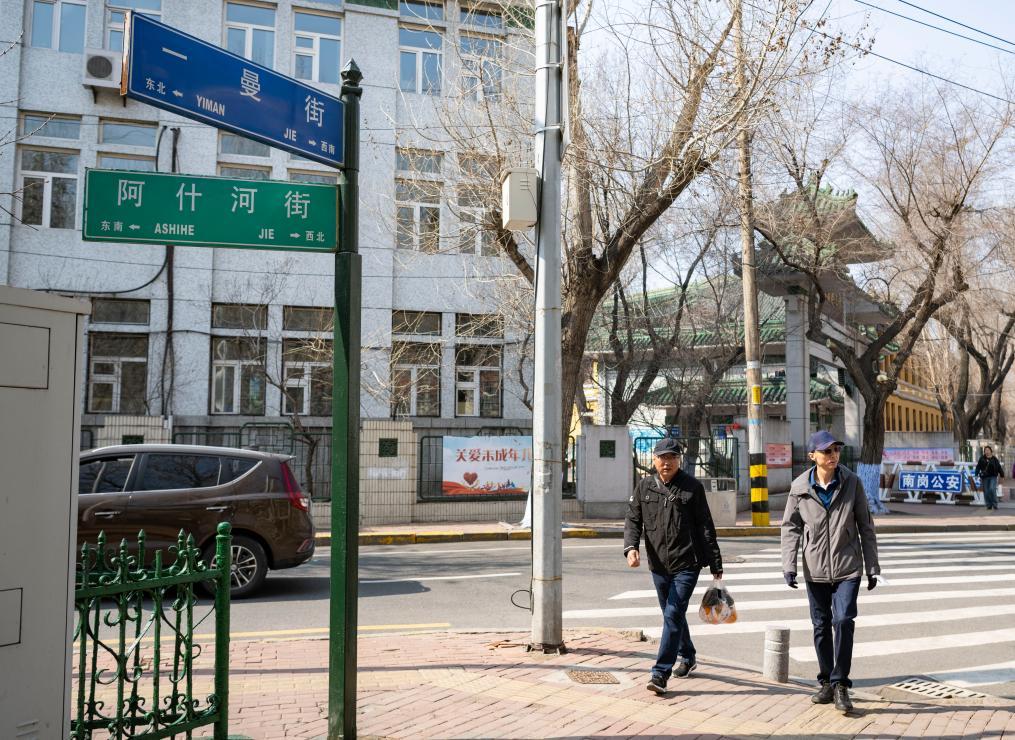 人們在黑龍江省哈爾濱市南崗區(qū)一曼街上行走(4月8日攝)。新華社記者 謝劍飛 攝