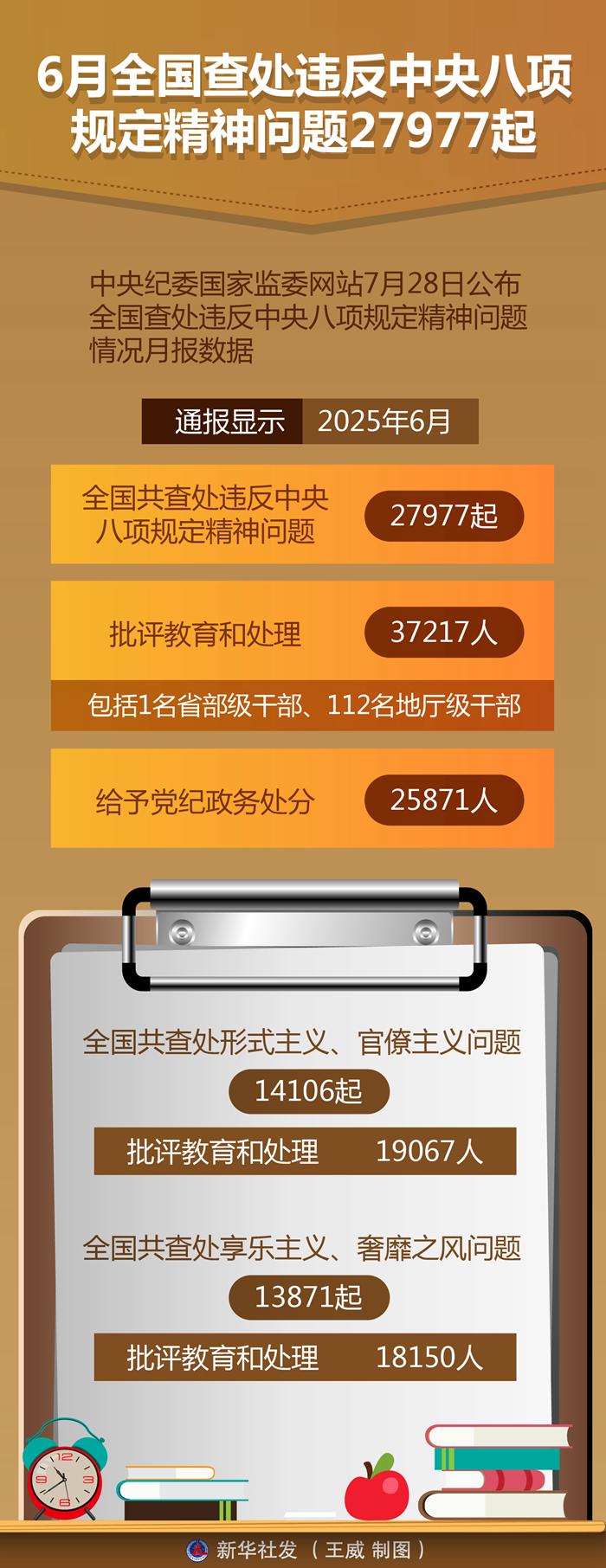 新華社北京7月28日電(記者孫少龍)中央紀委國家監(jiān)委網(wǎng)站28日公布全國查處違反中央八項規(guī)定精神問題情況月報數(shù)據(jù)。通報顯示,今年6月,全國共查處違反中央八項規(guī)定精神問題27977起,批評教育和處理37217人(包括1名省部級干部、112名地廳級干部),給予黨紀政務(wù)處分25871人。