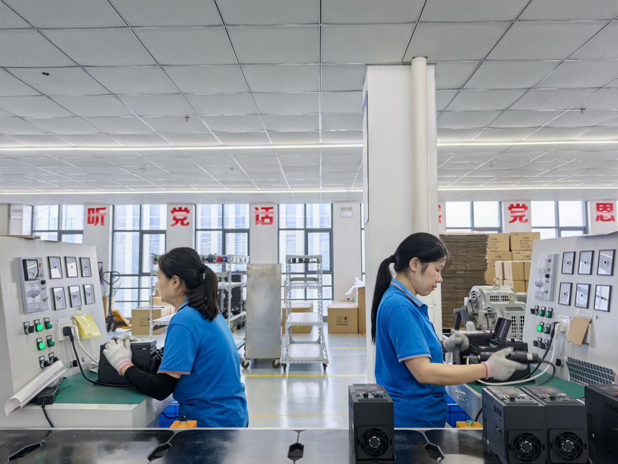 安徽海尚變頻技術(shù)有限公司產(chǎn)線員工在測試變頻器。