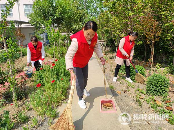 4月18日,埇橋區(qū)時村鎮(zhèn)沖疃村巾幗志愿者在清理村公園樹葉、塑料袋等雜物。