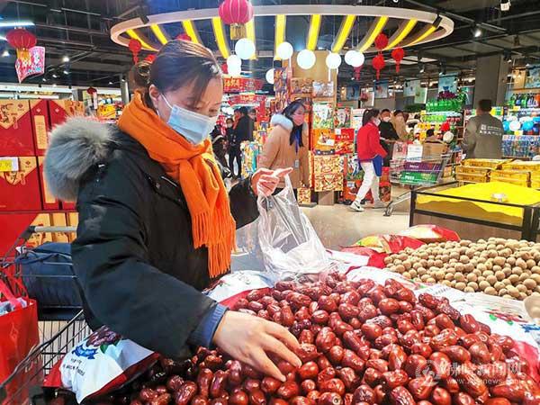 1月15日,市民在超市選購年貨。隨著春節(jié)臨近,我市各大超市內(nèi),生肖兔飾品、燈籠、禮盒、糖果、酒水飲料等商品擺放整齊,腌臘制品、有機雜糧、海鮮等各式南北干貨琳瑯滿目,購買年貨的市民絡(luò)繹不絕,呈現(xiàn)一派喜氣洋洋的新春氣象。 本報記者 王明輝 攝