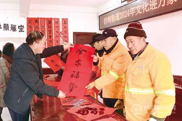 日前,埇橋區(qū)汴河街道文廣站開展“文化進(jìn)萬(wàn)家”迎春納福送春聯(lián)、歡歡喜喜過大年活動(dòng),為社區(qū)居民和堅(jiān)守崗位的環(huán)衛(wèi)工人書寫春聯(lián)100余幅、福字300余張。特約攝影 丁輝