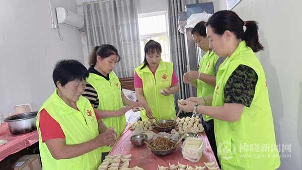 當(dāng)天,志愿者帶著準(zhǔn)備好的食材,來(lái)到魏寨村的“旭日夕陽(yáng)”活動(dòng)中心。大家分頭忙活,有的忙著洗菜、切菜,有的負(fù)責(zé)調(diào)餡,現(xiàn)場(chǎng)忙而不亂。只見一雙雙巧手上下翻飛,薄薄的餃子皮逐一被填餡、塑形,很快就把餃子包好了。
