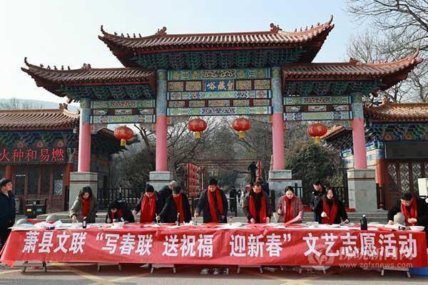 日前,由蕭縣文聯(lián)組織開展的“寫春聯(lián) 送祝福 迎新春”文藝志愿活動(dòng)在皇藏峪風(fēng)景區(qū)舉行。活動(dòng)邀請(qǐng)蕭縣書法家協(xié)會(huì)參與,書法愛好者揮毫潑墨,書寫寓意吉祥的春聯(lián)和“?!弊?,讓群眾在書香墨韻中提前感受年味。王子晗 攝