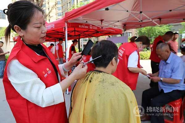志愿者在埇橋區(qū)北關(guān)街道淮海社區(qū)為市民義務(wù)理發(fā)。 特約攝影 張成伍